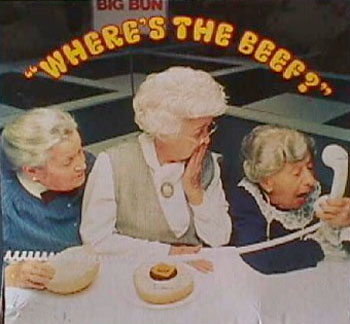 “Where’s the beef?” is a catchphrase common in the United States and Canada, introduced as a slogan for the fast food chain Wendy’s in 1984. Since then it has become an all-purpose phrase questioning the substance of an idea, event, or product.[1]