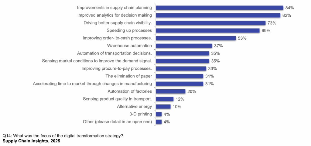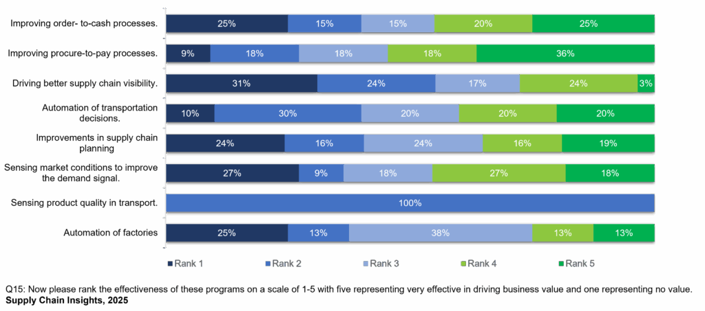 When you look at the results, companies were more successful in improving transactional efficiency than improving planning and supply chain visibility. The redefinition of transportation and the use of transportation streaming data remains an opportunity that few believe is currently driving effectiveness. (The issue is that we have to redefine Transportation Planning to gain true value. This is subject for another blog.)
