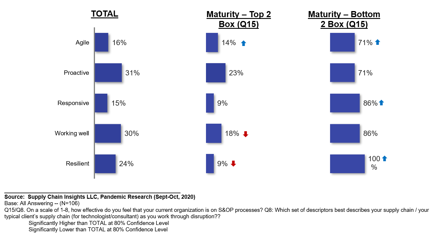When I ask executives to draw their supply chains today (an activity that I love to do to understand their mental models), companies will often draw a dead pool around S&OP. One company even used the metaphor of a Ferris Wheel that goes round and round to goes nowhere. In short, a lot of organizational energy spent, but with poor outcomes. As shown in Figure 2, companies that tightly integrated S&OP into the budget did worse before the pandemic but struggled even more managing the COVID-19 response. This is even worse if the company mandated IT standardization of planning to ERP.